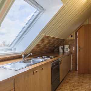 - Küche mit Backofen, Kochfeld, Kühlschrank, Kaffeemaschine, Toaster und Wasserkocher